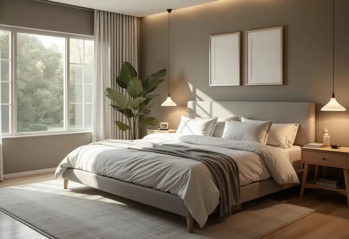 Pour personnaliser votre chambre taupe, pensez à diversifier les accessoires. Un tapis aux motifs géométriques, des œuvres d’art encadrées de noir ou des coussins colorés peuvent apporter du dynamisme sans nuire à l’élégance de la pièce. Les plantes d’intérieur, comme les fougères ou les succulentes, ajoutent une touche de verdure rafraîchissante et se marient parfaitement avec une palette taupe.