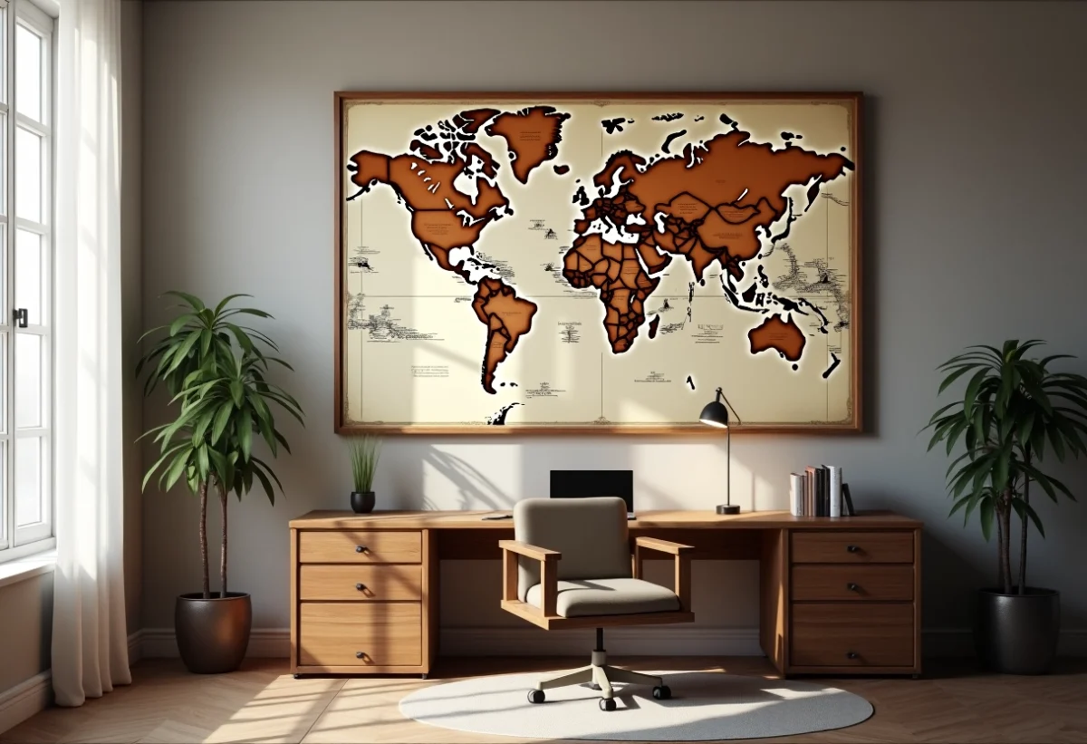 Une carte du monde en couleur dynamise l’espace par ses teintes vives et variées. Pour une interaction ludique, une carte du monde à épingler permet de marquer les lieux visités ou à visiter. Cette option est particulièrement prisée par les voyageurs assidus.