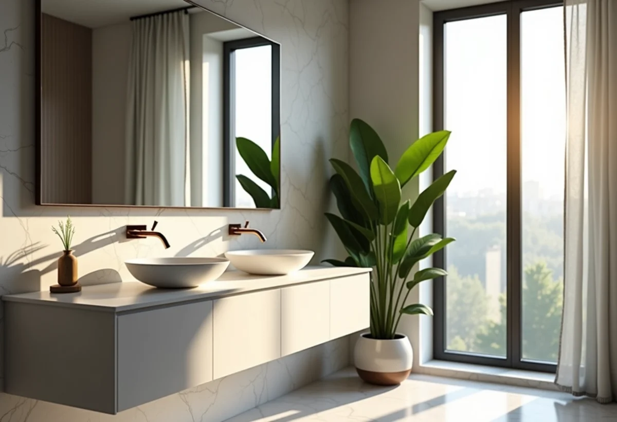 Pour sublimer cette installation, quelques astuces peuvent s’avérer précieuses. Opter pour des robinets muraux libère de l’espace sur le plan de travail, tandis qu’un éclairage bien pensé met en valeur la vasque. Les accessoires, tels que les porte-savons ou les miroirs assortis, complètent l’ensemble en apportant une touche harmonieuse et raffinée.