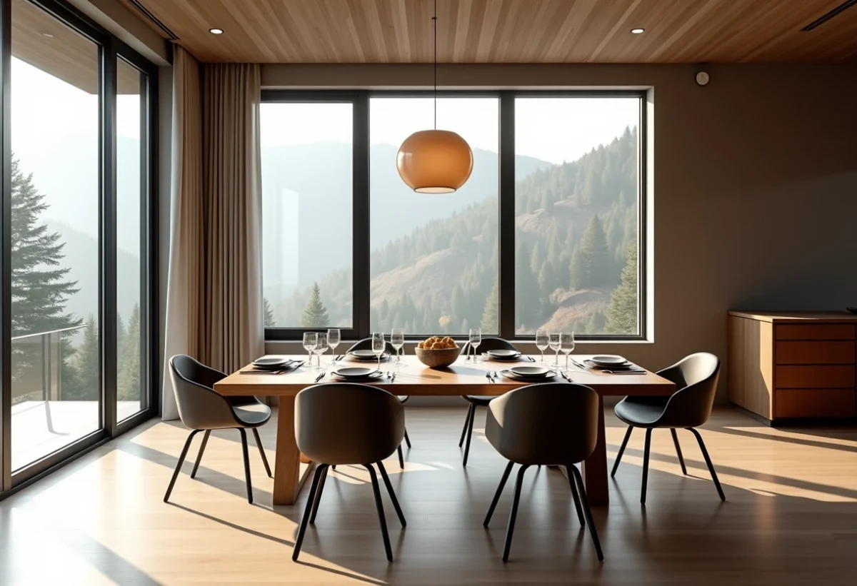 Pour une touche moderne, les tables carrées peuvent être une option intéressante. Une table carrée de 120 x 120 cm offre un espace suffisant pour six personnes tout en apportant une symétrie visuelle à la pièce.
